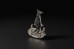 Crafted as a hard enamel pin with a silver nickel–plated finish, it is designed for symbolic wear, display, or inclusion in collections centered on occult aesthetics and mythic imagery.